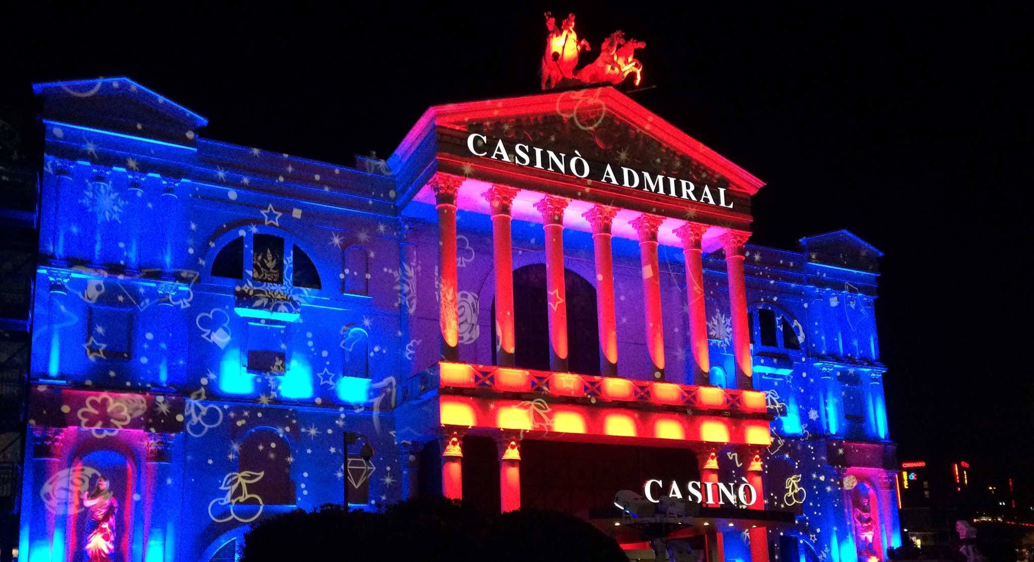 PROIETTA has realized themed dynamic projections on gambling houses in Switzerland and Venice. The graphics have been studied in line with the themes of the gambling or in combination with more Christmas subjects. For Christmas scenaries the dynamic effects are composed by fish poker or stars, combined with the cards symbols. The additional archiled technology increase the atmosphere. All these dynamic effects create an evocative scenography that can be customized with communication or official logos.